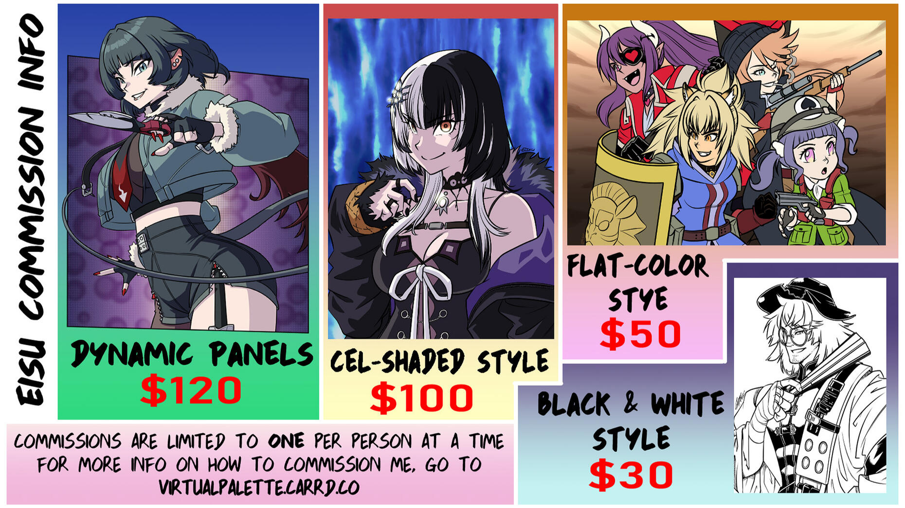 - Please ask if you want a commission in a style that's not listed (character design sheet, emotes, live2D Model design, etc).