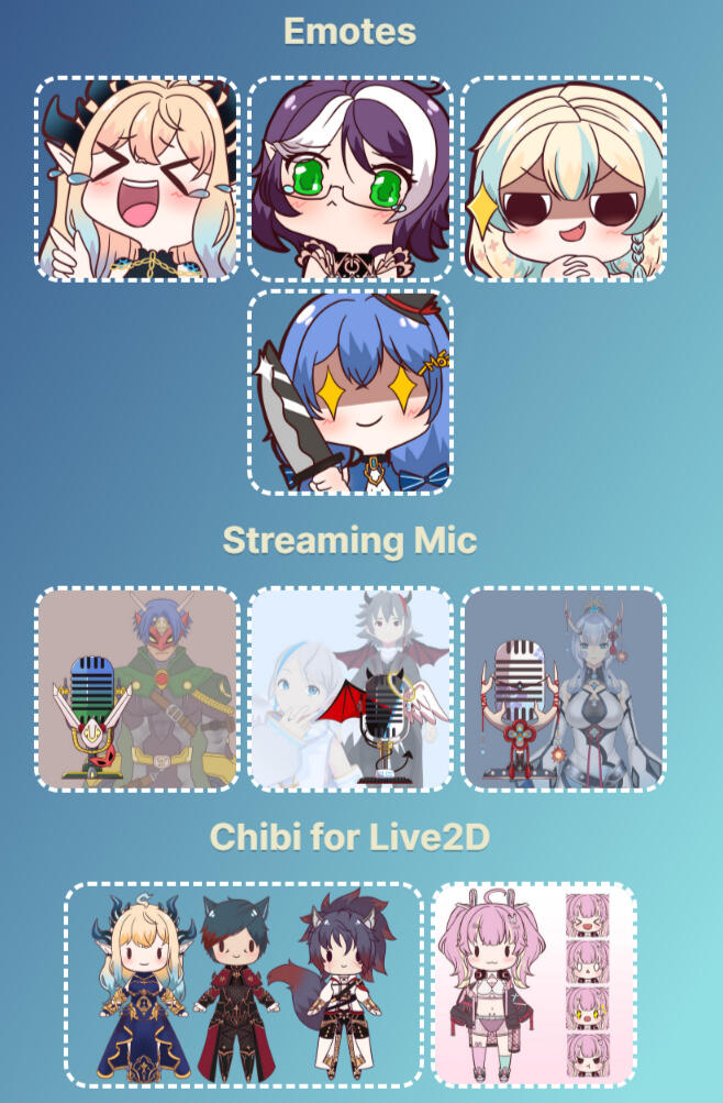 We have many years experience of creating vtuber and streaming assets, from illustrations, emotes, to Live2D and 3D models.